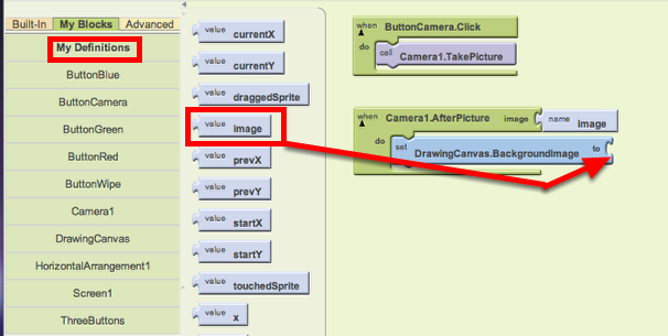 From the My Definition drawer, drag the image block and place it at the socket of the SetDrawingCanvas.BackgroundImage block.